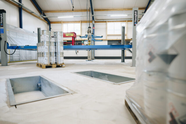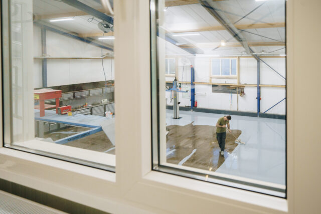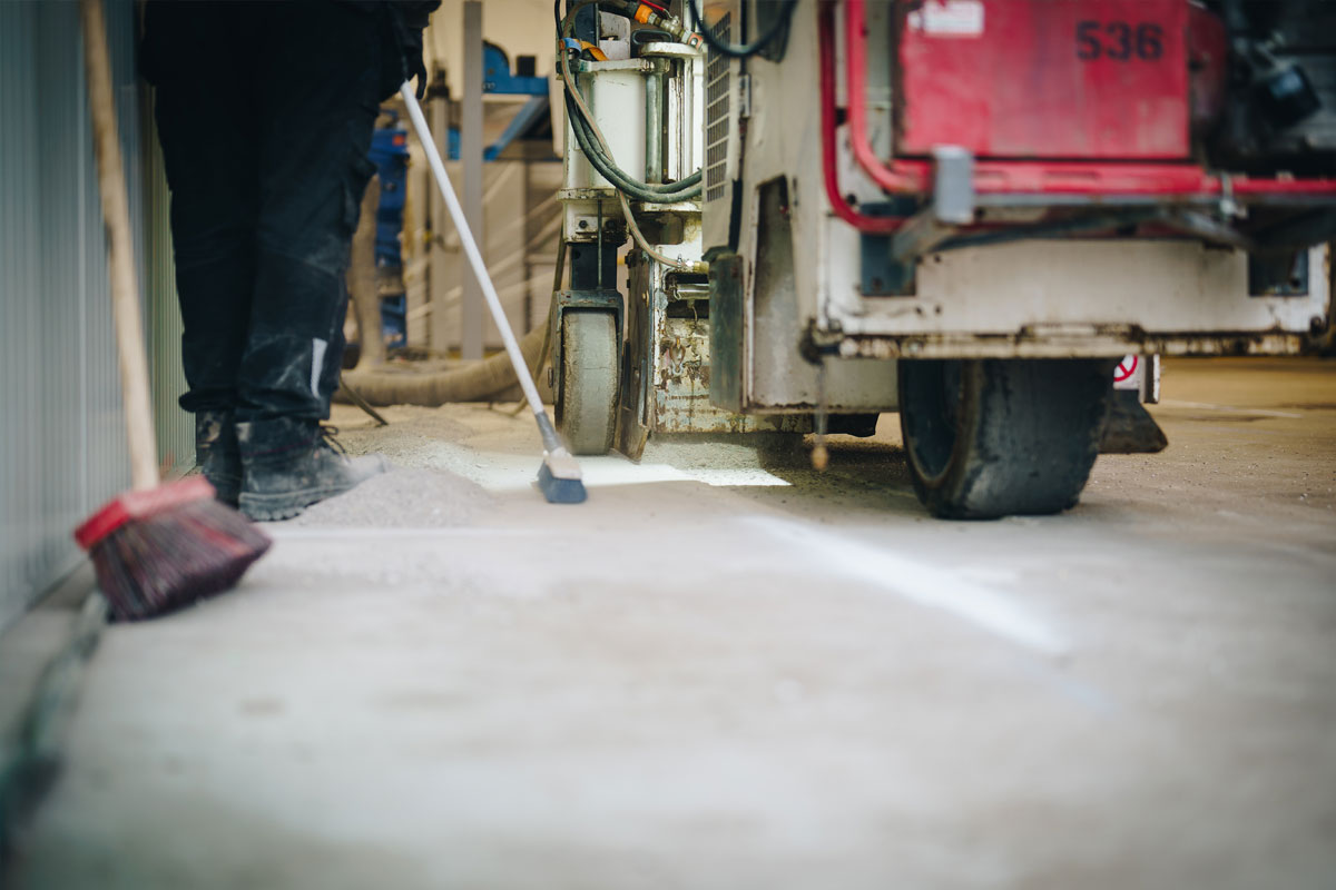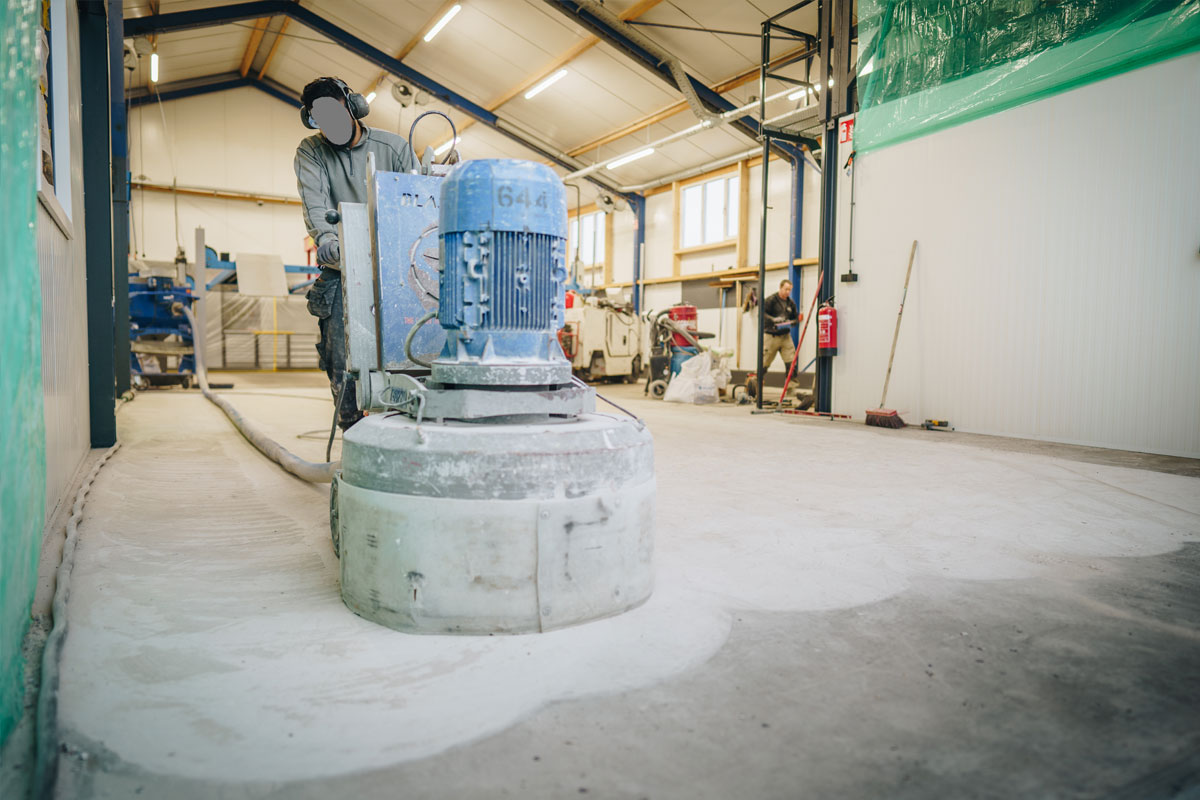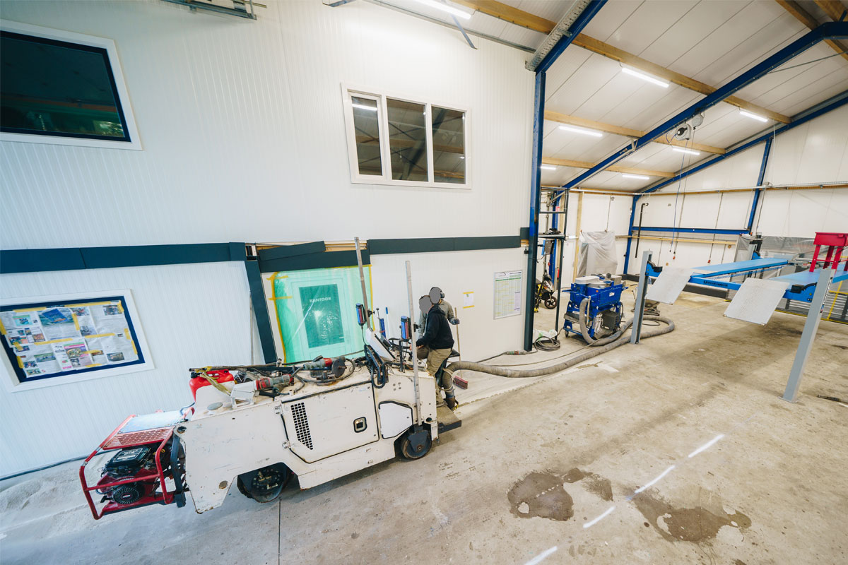 Om hieraan te kunnen voldoen is eerst een deel van de bestaande vloer gefreesd. Hiermee is de ondergrond voorbereid op een nieuwe, duurzame systeemopbouw die zowel technisch als visueel aansluit bij de werkplaatsomgeving.